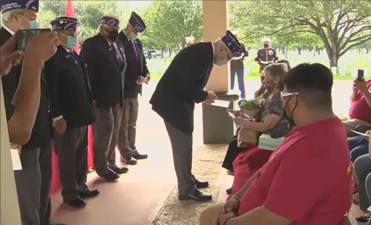SAN ANTONIO.- Un veterano local de ascendencia hispana, recibió una medalla póstuma del Corazón Púrpura de la Armada estadounidense en un evento en el Cementerio Nacional de Fort Sam Houston.