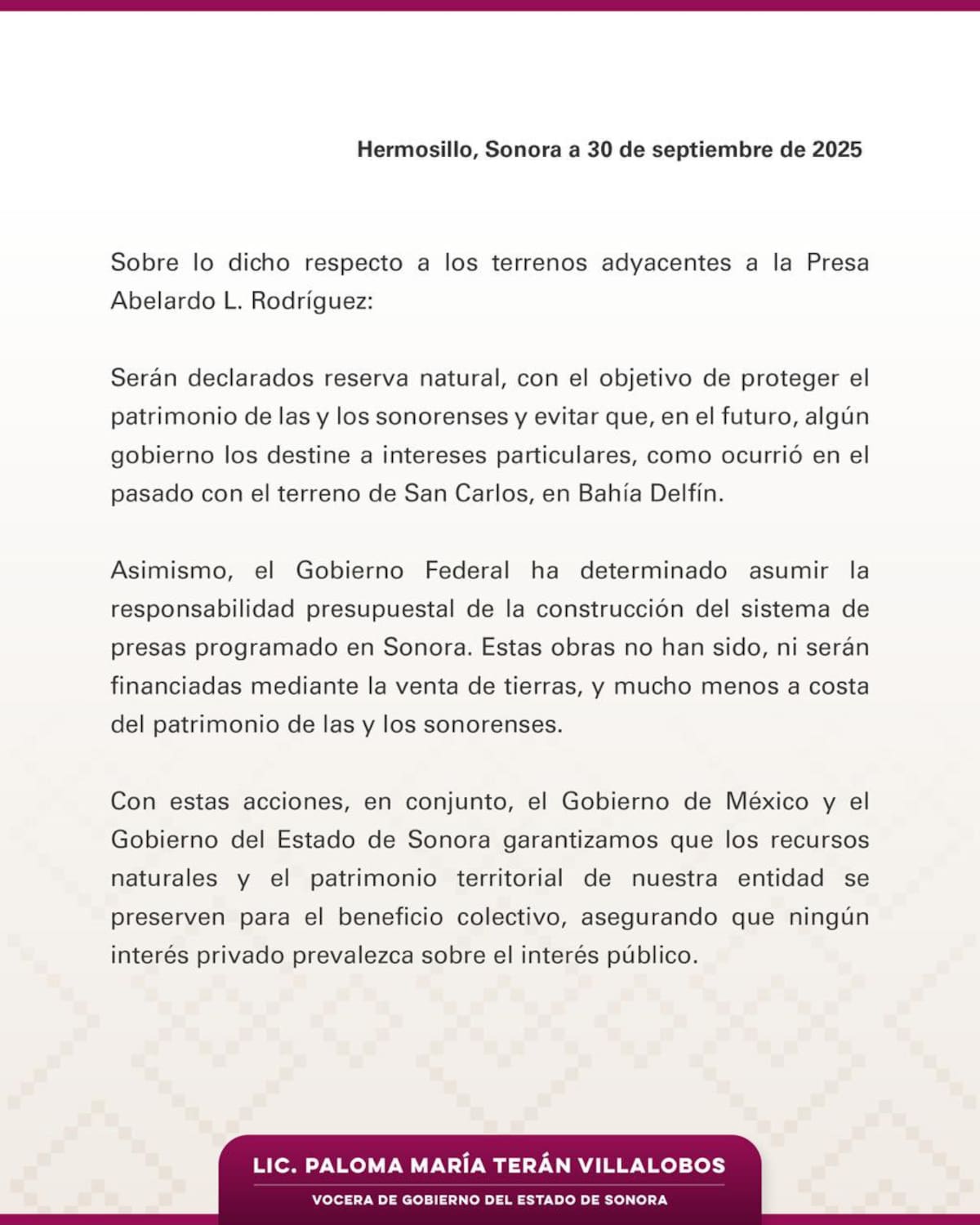 A través de su cuenta de X, Paloma Terán, la secretaria de Comunicación Social del Estado, informó que esto se realizará con el fin de proteger el patrimonio de los sonorenses.